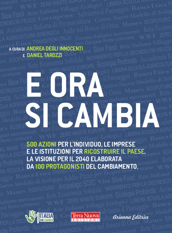 Anche tu vuoi aggiustare il mondo ma non sai come fare, la garanzia è scaduta e hai perso il libretto di istruzioni? Non preoccuparti, non sei il solo. Per venire incontro ai tanti che come te vogliono cambiare tutto ma non sanno bene come, Italia che Cambia ha chiamato a raccolta cento fra i maggiori esperti di cambiamento italiani, esponenti di altrettante associazioni, imprese, università, comitati. Ha chiesto loro di immaginare come potrebbe essere il mondo nel 2040 e di dirci cosa possiamo fare per realizzarlo: ne sono uscite diciassette visioni con centinaia di azioni concrete che tutti noi possiamo compiere a partire da oggi. Adesso questo enorme lavoro collettivo viene raccolto in un unico libro pubblicato da Terra Nuova Edizioni in coedizione con Arianna Editrice per rendere questa grande opportunità di cambiamento accessibile a tutti! È in uscita E ora si cambia - 500 azioni per l’individuo, le imprese e le istituzioni per ricostruire il Paese, un manuale pratico per cambiare il mondo a partire da noi stessi su diciassette tematiche fondamentali.